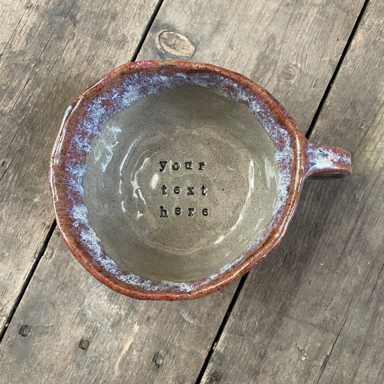 The mug will be made in a pale or neutral clay with black lettering. The colour of the glaze will vary depending on my current colour stock. Glaze colours cannot be requested.