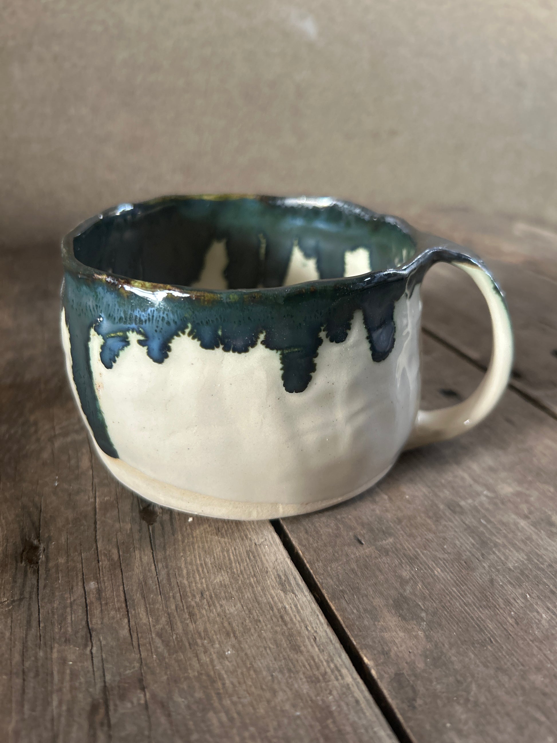 All of my stoneware pieces are carefully constructed by hand. This mug has been made by combining throwing and the 'pinch' method. Each one is shaped and finished by me. They are full of character including finger marks, wobbly edges, glaze splats and drips which add to their charm and rustic feel. Perfectly imperfect.